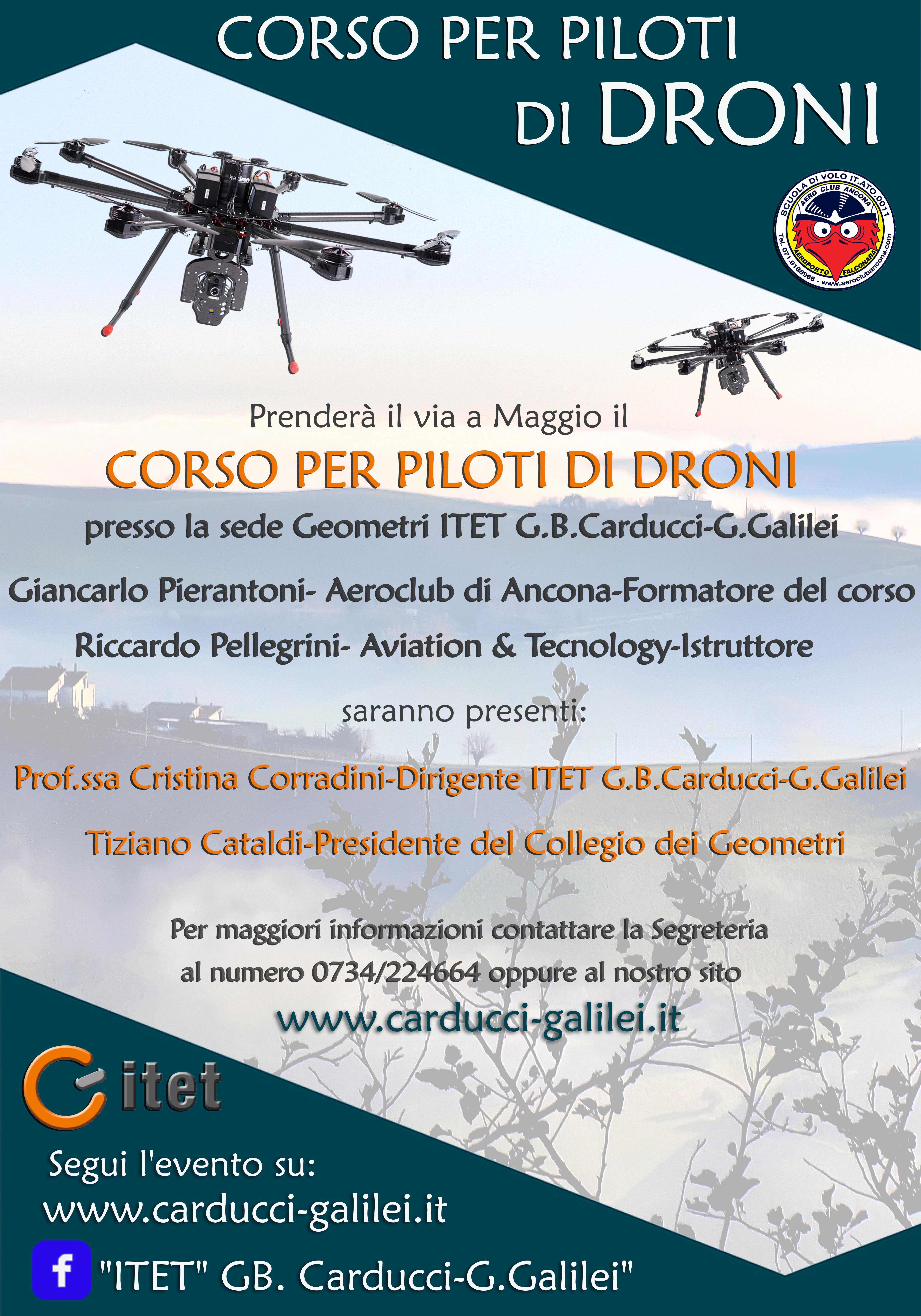L'Aeroclub di Ancona ha dato il via martedì 22 maggio al primo corso per “Pilota di droni” presso la sede geometri dell'istituto fermano, che si conferma sempre attento ai settori in evoluzione che possano garantire sbocchi lavorativi pratici a chi si dovrà confrontare con il mondo del lavoro: si inizia nei mesi di maggio e giugno con 8 giorni di lezioni di teoria (di quattro ore ognuna), in cui saranno illustrate nozioni di normativa aeronautica, circolazione aerea, meteorologia e ovviamente impiego del Sistema Aeromobile a Pilotaggio Remoto, utilizzato per fini diversi da quelli ricreativi e sportivi, con riferimento ai componenti necessari per il controllo e comando (stazione di controllo) da parte di un pilota remoto.